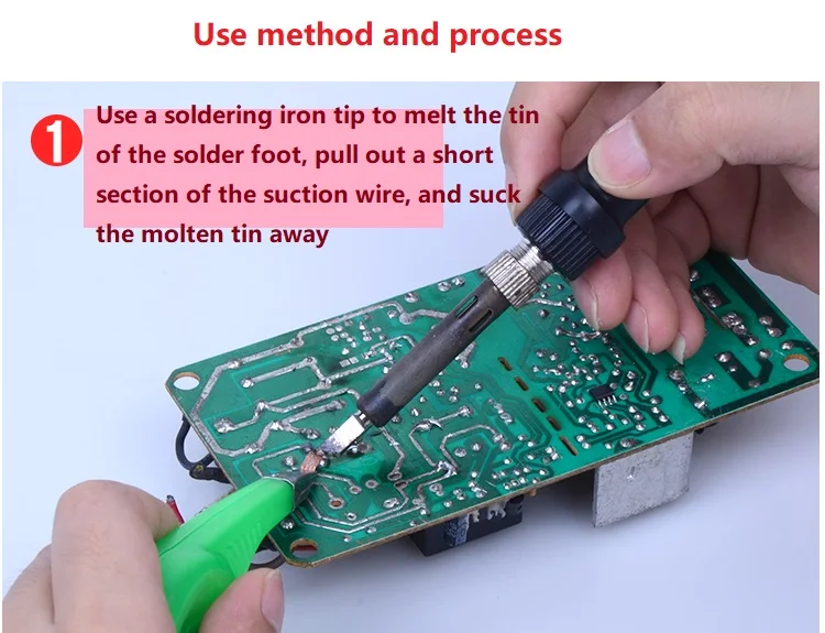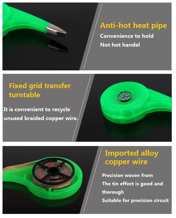 Особенности: 1, Высококачественная оплетка с уникальным без чистого потока 2. Рот из нержавеющей стали обеспечивает защиту от горячей воды 3. Эргономичный диспенсер для точного управления длиной припоя 4, полный спецификация для выбора, чтобы удовлетворить ваши приложения.