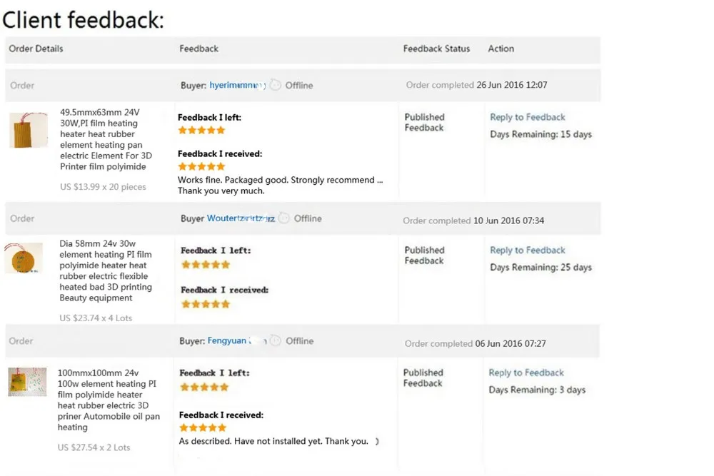 Специальный заказ в соответствии с вашими требованиями возможен, пожалуйста, сообщите нам ваши требования в деталях. Мы изготовим для вас и предоставим Вам лучшую цену.Параметры производительности◆Теплоизоляционный слой: Полиимидная Пленка◆Нагревательный сердечник: лист из сплава