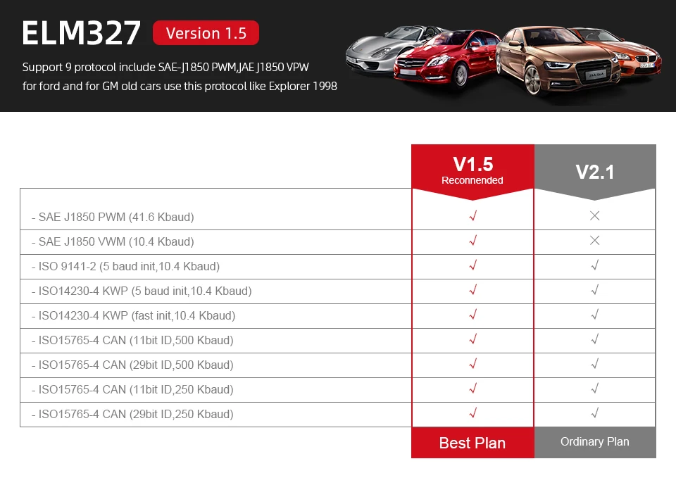 1.V 1,5 ELM327 работает с 9 протоколами, включая SAE-J1850 PWM , JAE J1850 VPW , V2.1 не может работать.