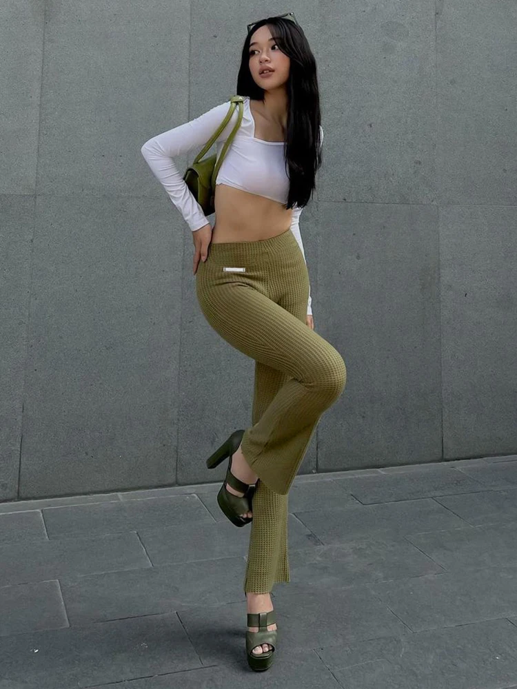 Базовые Женские расклешенные брюки Yitimoky с вафельным принтом черные