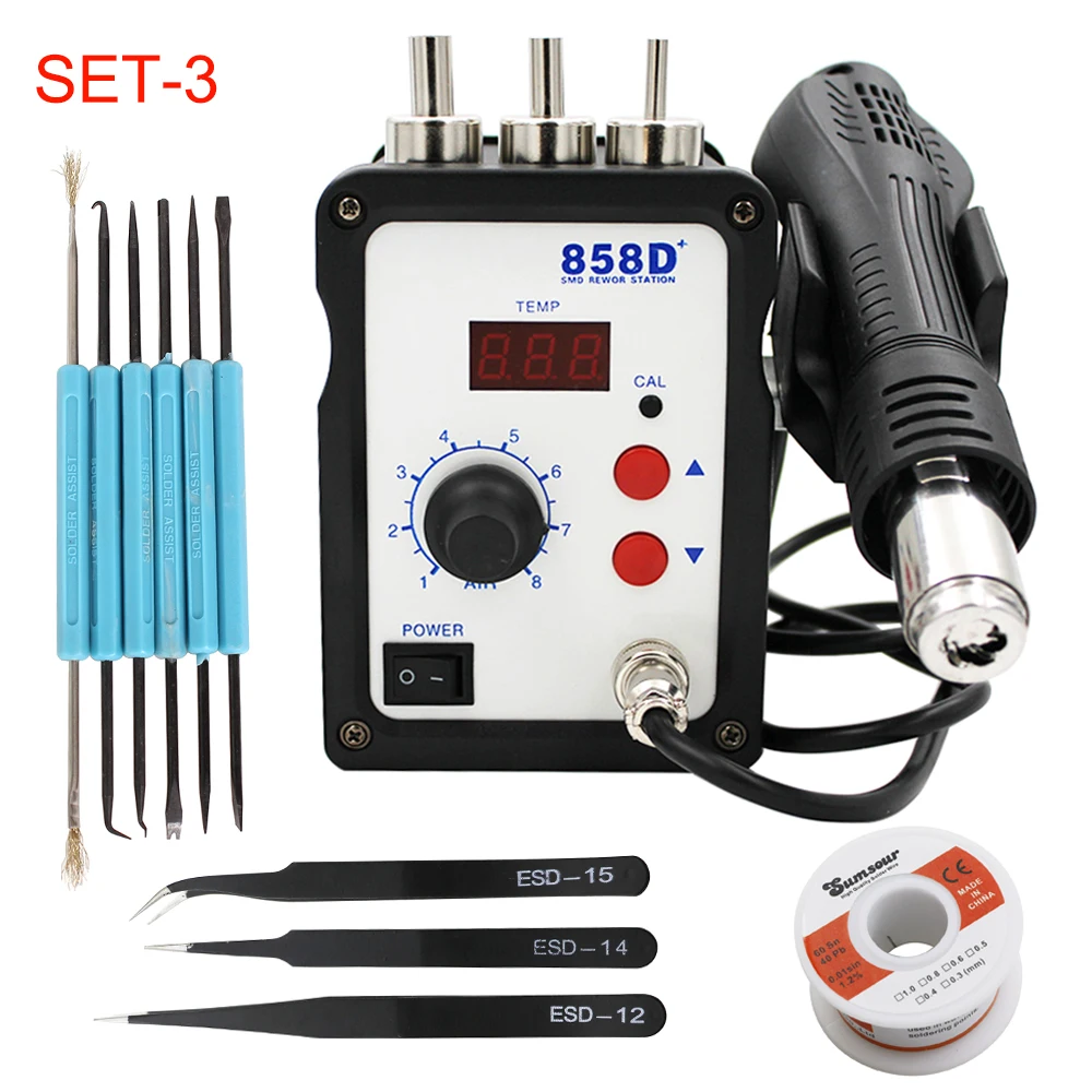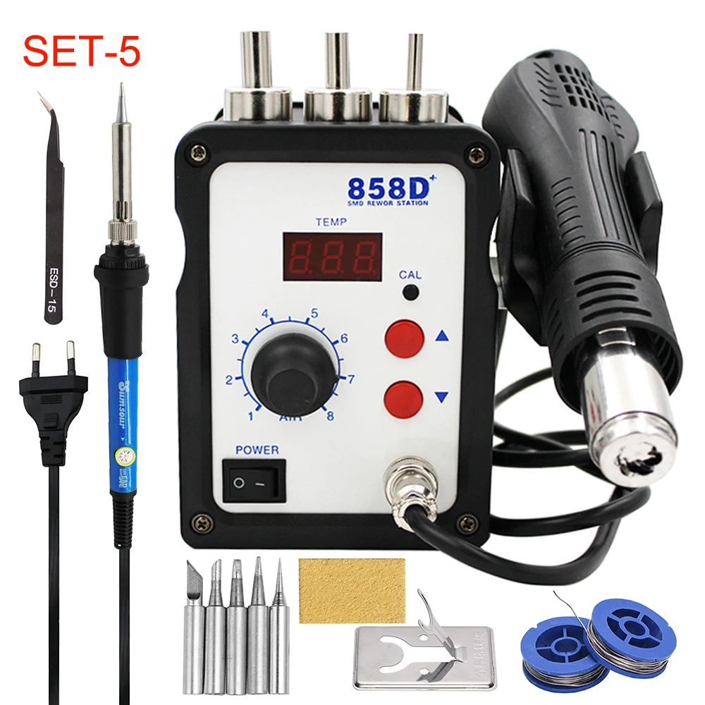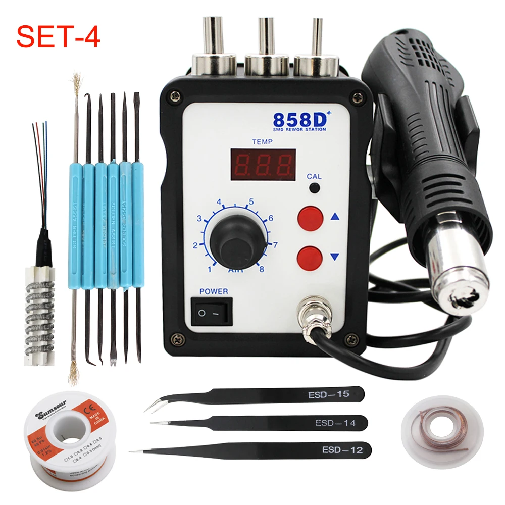 1 x 858D + паяльная станция 1 x паяльная проволока 1x6-в-1 вспомогательные сварочные инструменты 3 пинцета Нагреватель теплового пистолета-1 шт.