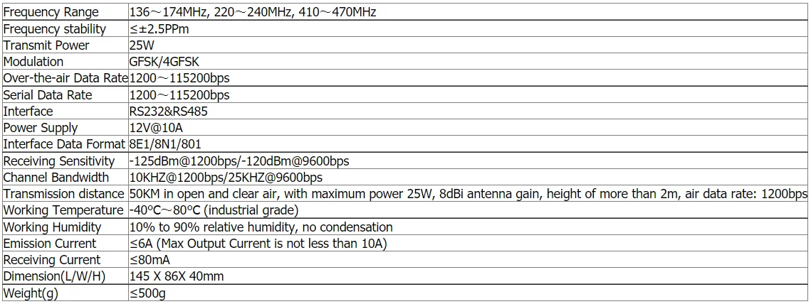 Over-the-air data rate from 1200bps to 115200bps,interface data rate 1200-115200bps user programming;