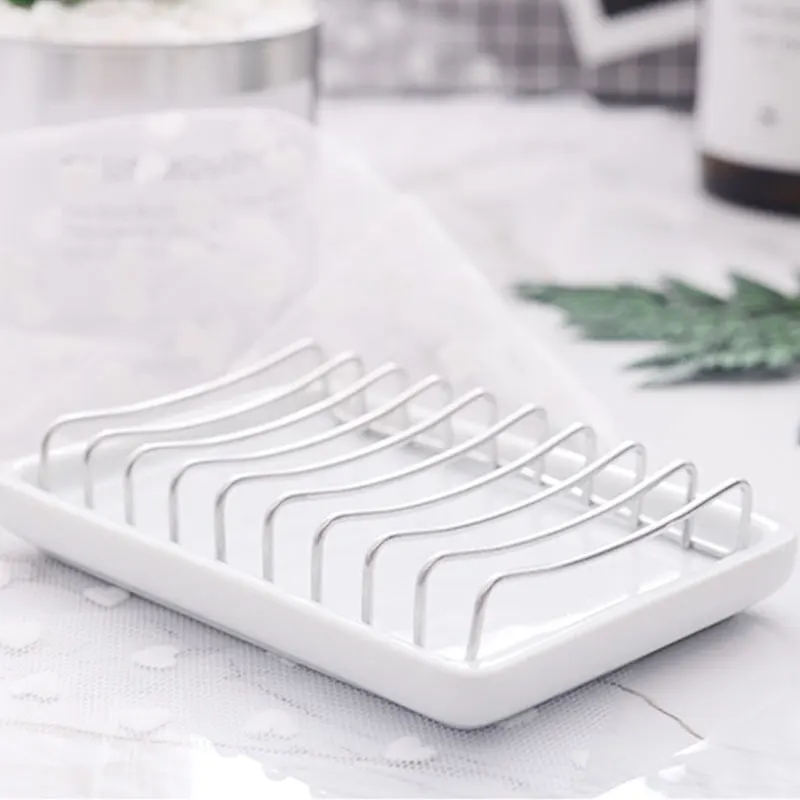 Name: Soap box Weight:0.28kg Packing:carton packaging Size:12.5*9.2*2.5cm Material:ceramic + stainless steel Package included: 1*Soap box