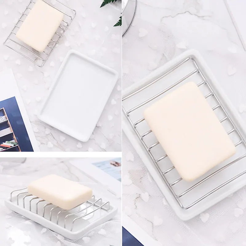 1.Material: Made of high quality stainless steel and premium ceramic,and good silicone. 2.Dual-layer design easy to clean, , keeps soap bars clean and off of countertops. 3.The water drains off the soap so the soap doesn't melt easily, extending the life of your soap. 4.Allows soap to dry between each use, reducing bacteria growth. 5.Elegant and generous design highlight your taste,and durable than plastic,great in the kitchen or bathroom.