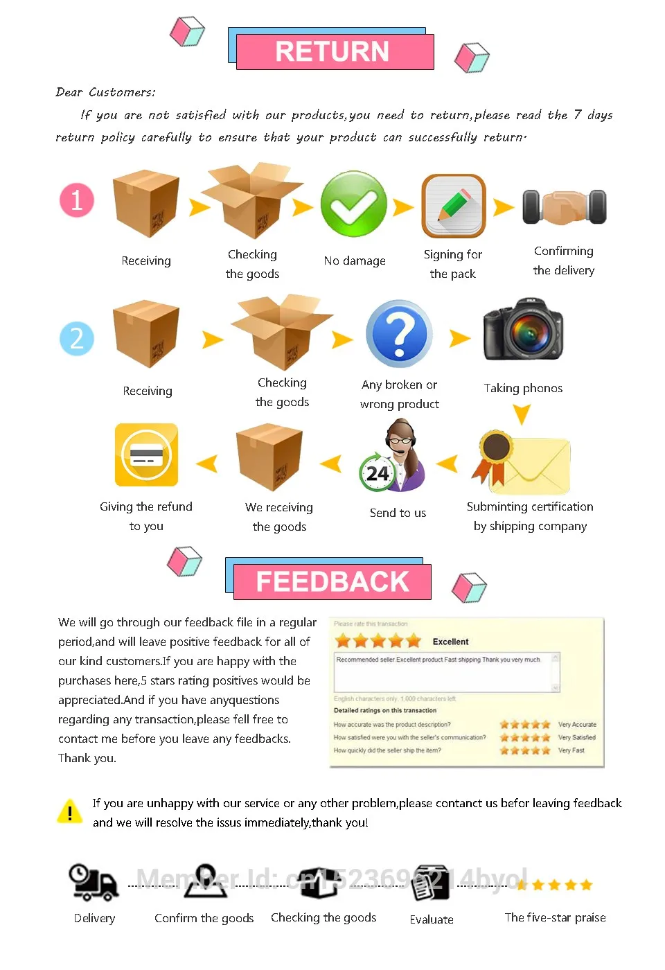 Return Policy | If the product you receive is not as described or low quality, the seller promises that you may return it before order completion (when you click "Confirm Order Received" or exceed confirmation timeframe) and receive a full refund. The return shipping fee will be paid by you. Or, you can choose to keep the product and agree the refund amount directly with the seller. N.B.: If the seller provides the "Longer Protection" service on this product, you may ask for refund up to 15 days after order completion. |
