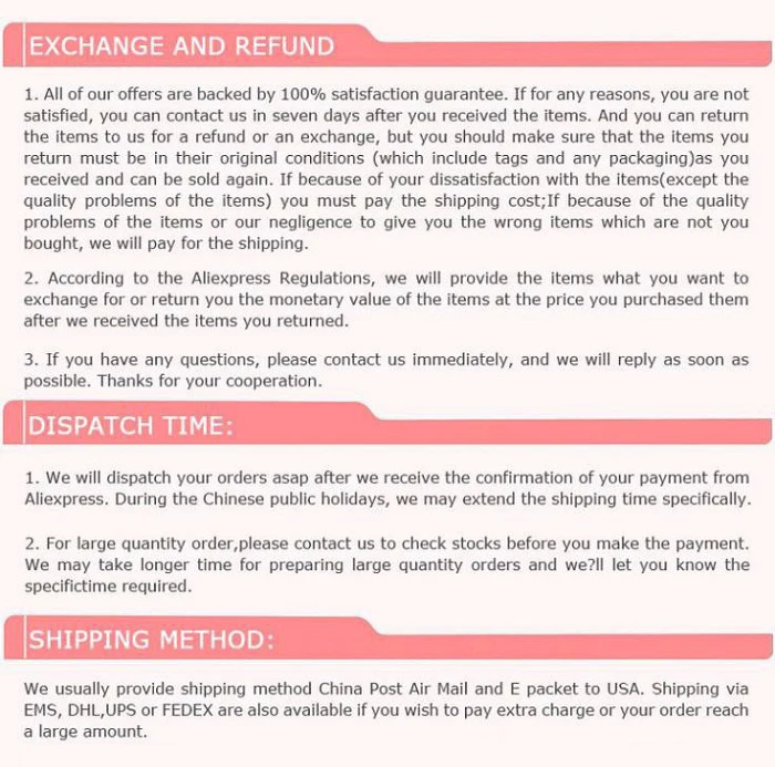 Return Policy | If the product you receive is not as described or low quality, the seller promises that you may return it before order completion (when you click "Confirm Order Received" or exceed confirmation timeframe) and receive a full refund. The return shipping fee will be paid by you. Or, you can choose to keep the product and agree the refund amount directly with the seller. N.B.: If the seller provides the "Longer Protection" service on this product, you may ask for refund up to 15 days after order completion. |