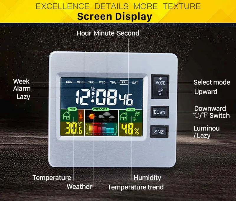 Многофункциональные часы с будильником и повторяющейся функцией Большой ЖК-дисплей будет одновременно отображать погоду, температуру, влажность, погодные условия и т. д. Многоцветный дисплей с подсветкой для удобного чтения Отображение температуры и влажности в реальном времени. Он также показывает тенденции температуры E Icons прогноз погоды, включая солнечную, слегка облачную, облачную и дождливую Простота установки и использования с поддерживающим кронштейном и подвесным отверстием Идеально подходит для спальни, офиса, кухни и т. д. Примечание: в целях экономии энергии, ночной Светильник функция будет светильник в течение 8 секунд, когда вы нажимаете SNZ ключ