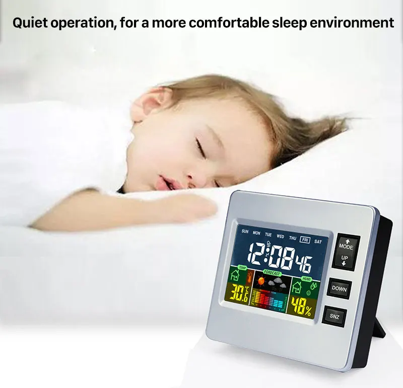 Погодные часы подходят для маленькой тумбочки. Он имеет двойные сигналы с функцией повтора, что затрудняет людей пропускать важные пункты. После установки 2 желаемого времени в качестве будильника просто нажмите на значок будильника внизу, чтобы выбрать один, оба или ни один будильник для активации. Такой гибкий выбор адаптируется к различным жизненным графикам людей.