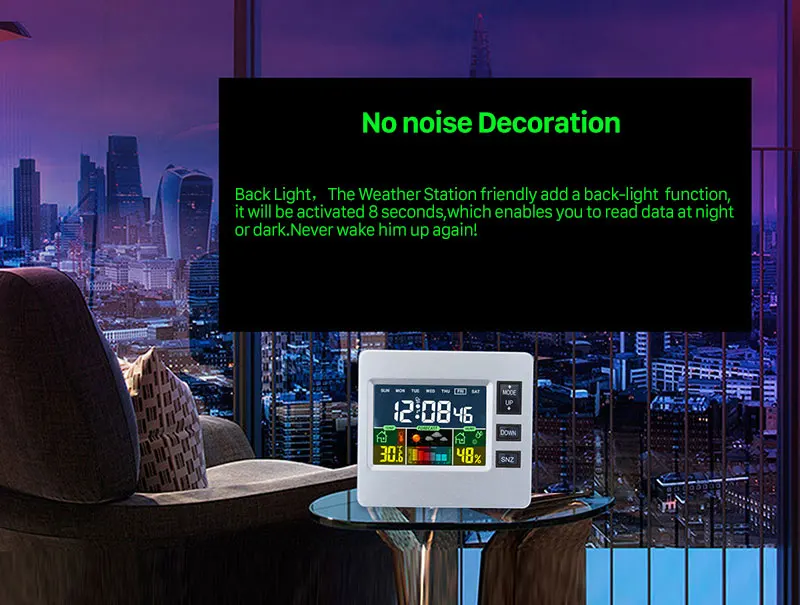 Задний светильник, Погодная станция добавит обратно-светильник, он будет активирован 8 s, что позволяет вам читать данные ночью или в темноте. Никогда не будите его снова!