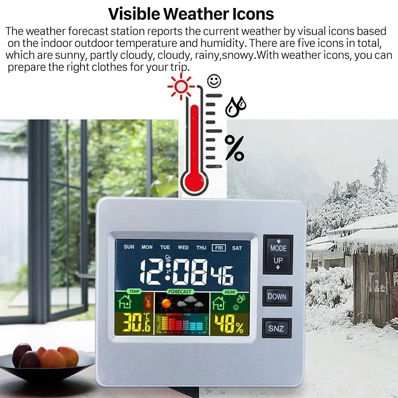 Станция прогноза погоды сообщает о текущей погоде визуальными значками на основе температуры и влажности внутри помещений. Есть пять значков в общей сложности, которые являются солнечными, частично облачными, облачными, дождливыми, снежными. С иконами погоды, вы можете подготовить правильную одежду для вашей поездки.