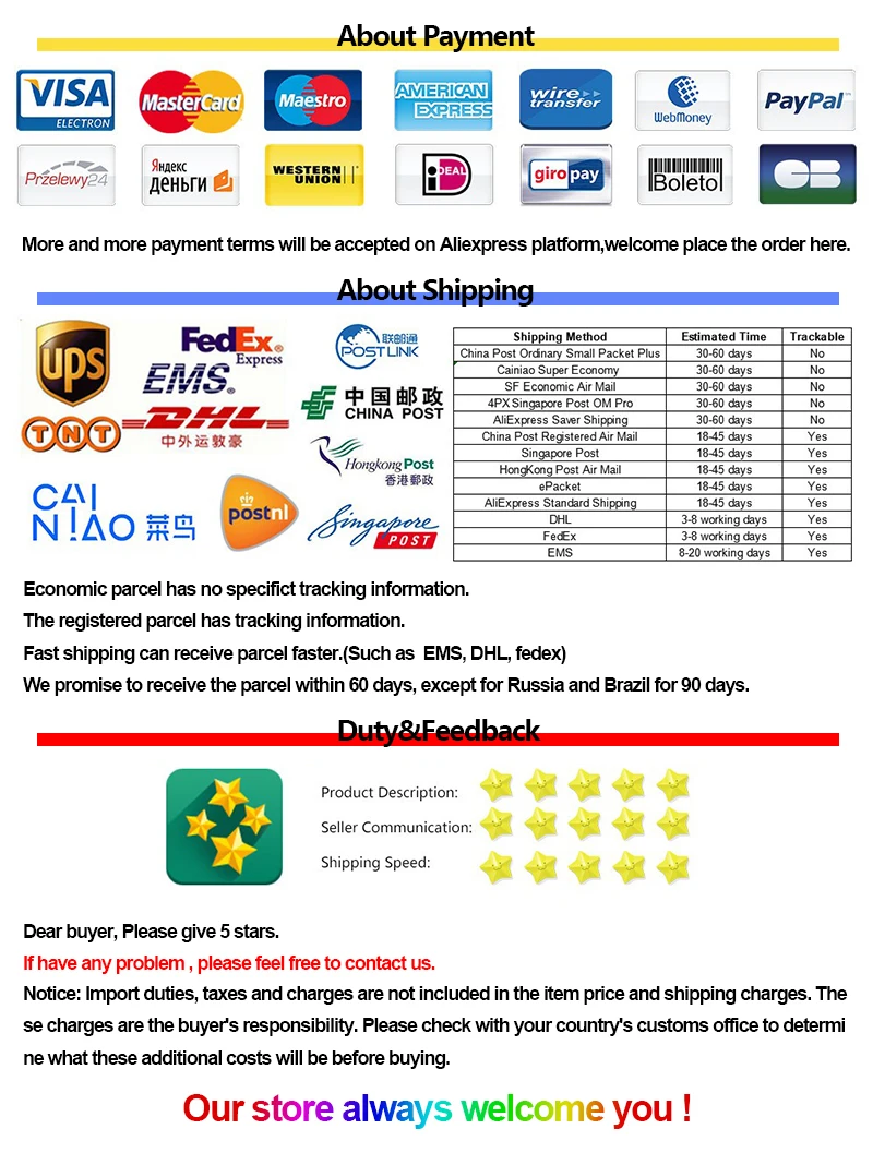 Return Policy | If the product you receive is not as described or low quality, the seller promises that you may return it before order completion (when you click "Confirm Order Received" or exceed confirmation timeframe) and receive a full refund. The return shipping fee will be paid by you. Or, you can choose to keep the product and agree the refund amount directly with the seller. N.B.: If the seller provides the "Longer Protection" service on this product, you may ask for refund up to 15 days after order completion. |