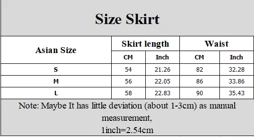 Размер юбки Азиатский размер; Длина юбки; Талия См дюйм см дюйм S 54 21,26 82 32,28 M 56 22,05 86 33,86 L 58 22,83 90 35,43 "Примечание: возможно небольшое отклонение (около 1-3 см) в качестве ручного измерения, 1 дюйм = 2,54 см"