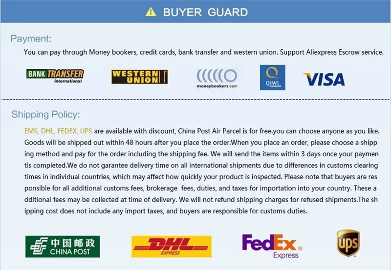 Return Policy | If the product you receive is not as described or low quality, the seller promises that you may return it before order completion (when you click "Confirm Order Received" or exceed confirmation timeframe) and receive a full refund. The return shipping fee will be paid by you. Or, you can choose to keep the product and agree the refund amount directly with the seller. N.B.: If the seller provides the "Longer Protection" service on this product, you may ask for refund up to 15 days after order completion. |